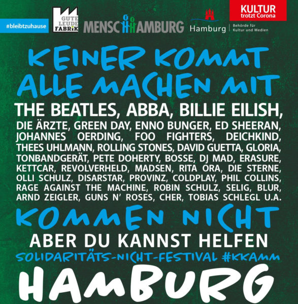 #KKAMM | Gemeinsam mit dem Verein MenscHHamburg haben wir ganz kurzfristig ein Solidaritäts-Nicht-Festival mit einem großartigen Line-Up zusammengestellt, u.a. mit The Beatles, Abba, Deichkind, Johannes Oerding, Billie Eilish, Tobias Schlegl und vielen weiteren großartigen Bands und Künstlern. Einziger Haken: All diese Bands kommen nicht, aber ihr könnt euch ab sofort Tickets kaufen und damit Gutes tun. Die Einnahmen der Veranstaltungen gehen nämlich direkt an die Hamburger Kulturszene, die besonders stark von der Corona-Krise betroffen ist. Tickets, Infos und mehr gibt’s auf unseren Social Media Kanälen und hier.